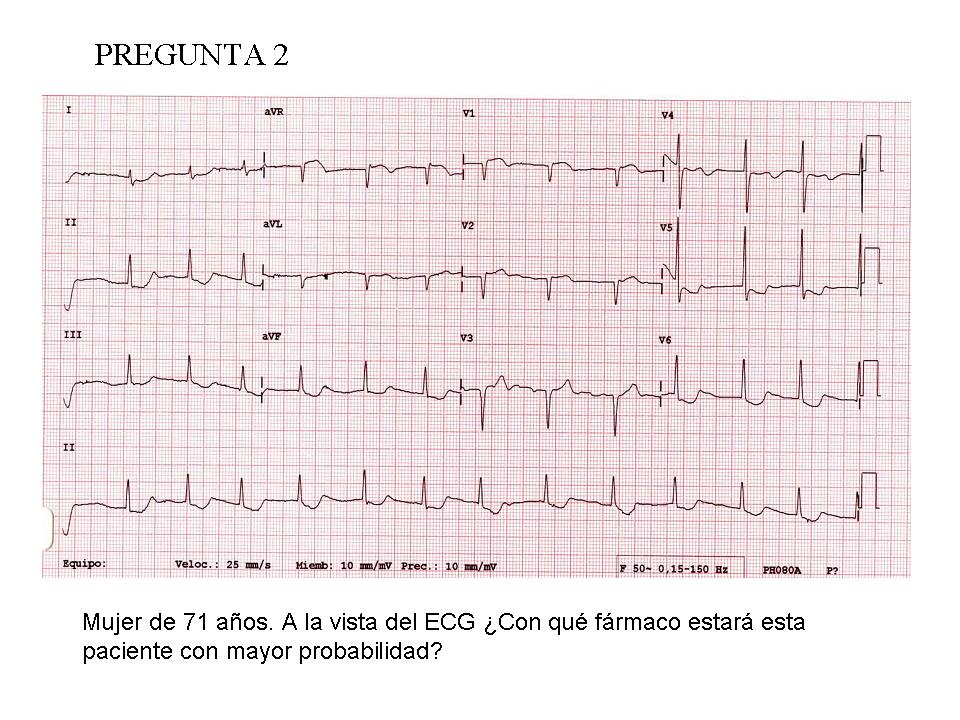 La respuesta es la 2. El ECG muestra una fibrilación auricular con un segmento ST típico de cubeta digitálica y además al estar en FA el paciente tendría que estar tomando Sintrom, de forma general (podria haber excepciones, porque no añadimos mucho más en la historia). Por tanto descartariamos la 1, la 3 y la 4. La 3 además porque por la puntuación CHA2DS2-VASC con ser mujer y 71 años tiene una puntuacion de 2, por tanto NO tiene indicación de Adiro. Respecto a las 2 y a la 5, la morfologia del segmento ST orienta más a la Digoxina