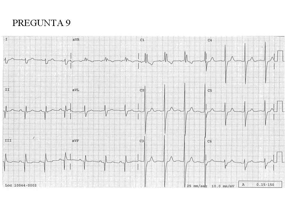 La respuesta es la 1. Este ECG tiene mucho «ruido». Hay un BRDcha+BSARI pero seguro que todo el mundo ha visto las ondas Q en cara inferior. Por tanto lo más probable dentro de lo que hay respecto al tratamiento es que lleve AAS y casi seguro un hipolipemiante.