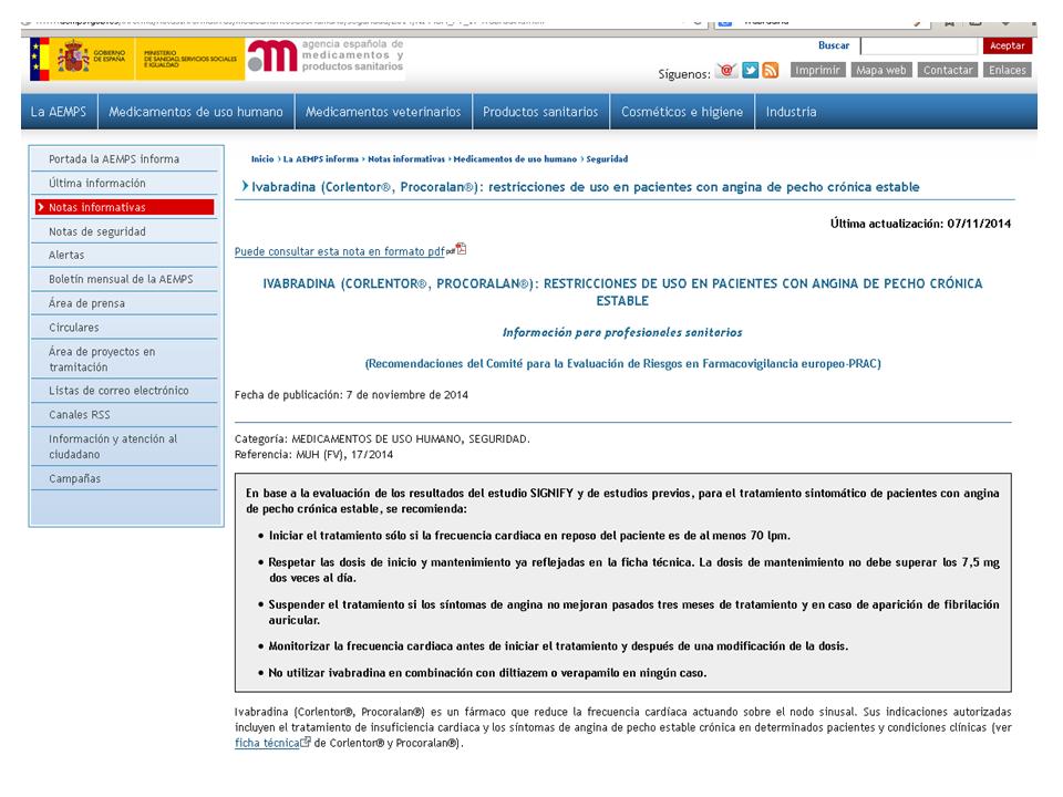 Recientemente y tras evaluar los resultados del estudio SIGNIFY1 la Agencia Española del Medicamento y Productos Sanitarios (AEMPS), dependiente del Ministerio de Sanidad, ha actualizado las restricciones de uso de la ivabradina en pacientes con angina de pecho crónica estable, atendiendo a las recomendaciones del Comité para la Evaluación de Riesgos en Farmacovigilancia europeo-PRAC. Este organismo aconsejaba, tras evaluar, iniciar el tratamiento sólo si la frecuencia cardíaca en reposo del paciente es de al menos 70 pulsaciones por minuto