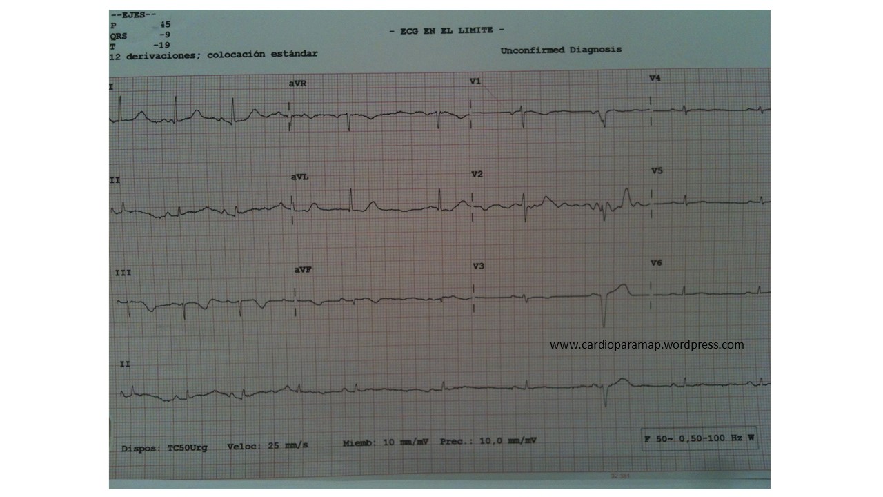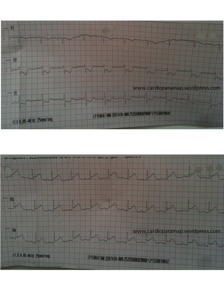 Durante el traslado la enferma se queda asintomática, cuando llevaba aproximadamente 180 minutos de sensación de opresión de forma continuada desde el inicio del cuadro. Al llegar a urgencias la enferma está asintomática, estable y se le realiza un nuevo ECG en el que el SEGMENTO ST SE HA NORMALIZADO. Fijaros en el ECG. ¡Vaya cambio! ¡Cualquiera lo diría!