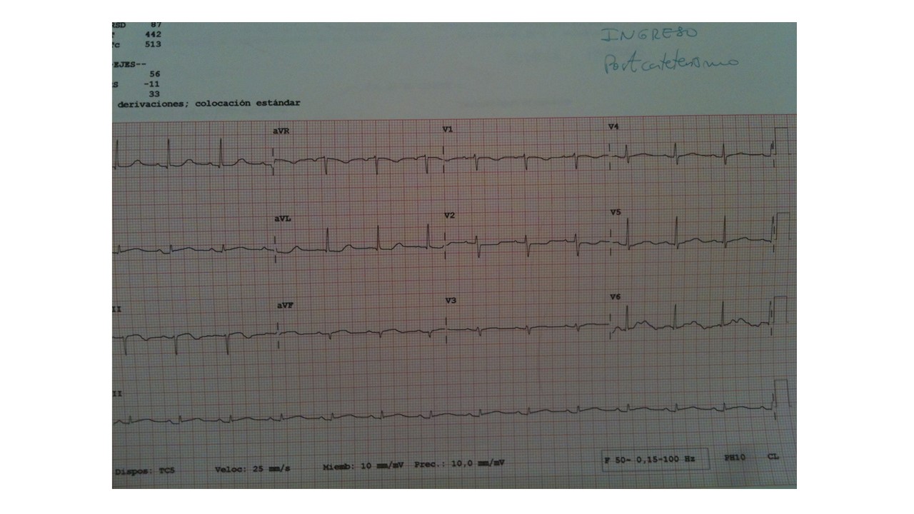 Mujer de 72 años que presenta de forma brusca, mientras caminaba en llano, sensación de opresión en ambos brazos, acompañada de sudoración profusa que no cede al quedarse en reposo, por lo que solicita ayuda después de unos 90 minutos del inicio del cuadro. Es valorada por el servicio de urgencias SUMMA 112 que comprueba que la enferma está normotensa, con una frecuencia cardiaca de 72 lpm le realiza un electrocardiograma en el que se observa corriente de lesión subepicárdica inferoposterolateral.