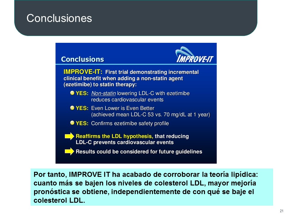 Pero los resultados del estudio IMPROVE-IT publicados en noviembre 2014 pusieron de manifiesto el beneficio clínico cuando se añade ezetimiba a una estatina.