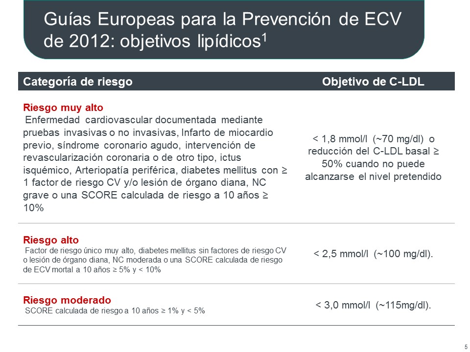 - Cualquiera de los pacientes de los tres grupos anteriores que sea intolerante a las estatinas o para quien las estatinas estén contraindicadas, y cuyos niveles de c-LDL estén por encima de 100mg/dL