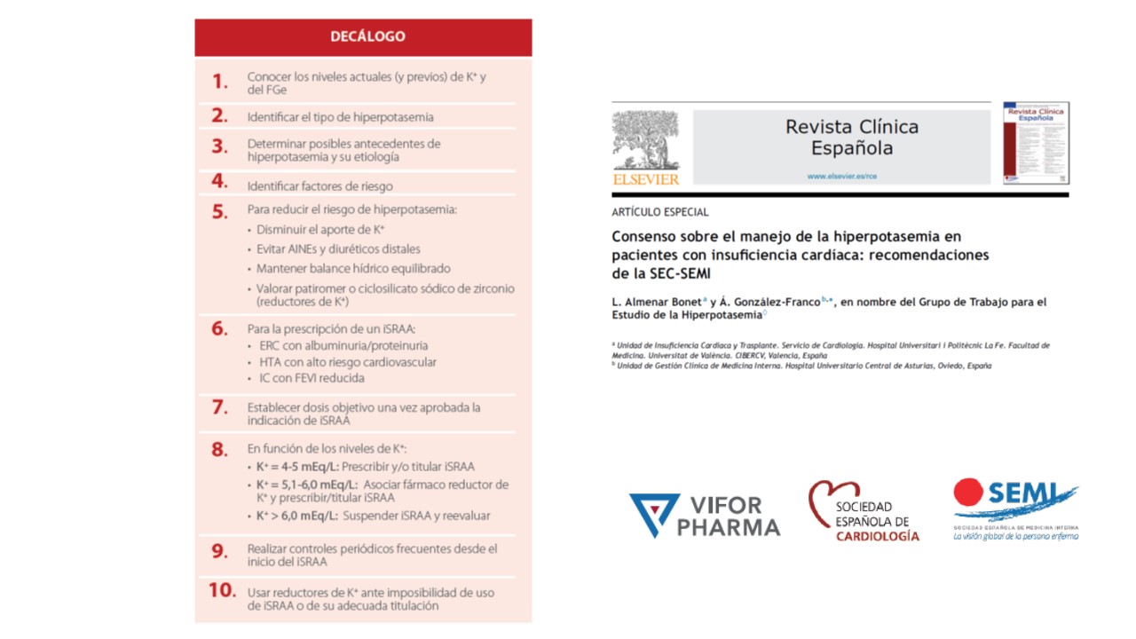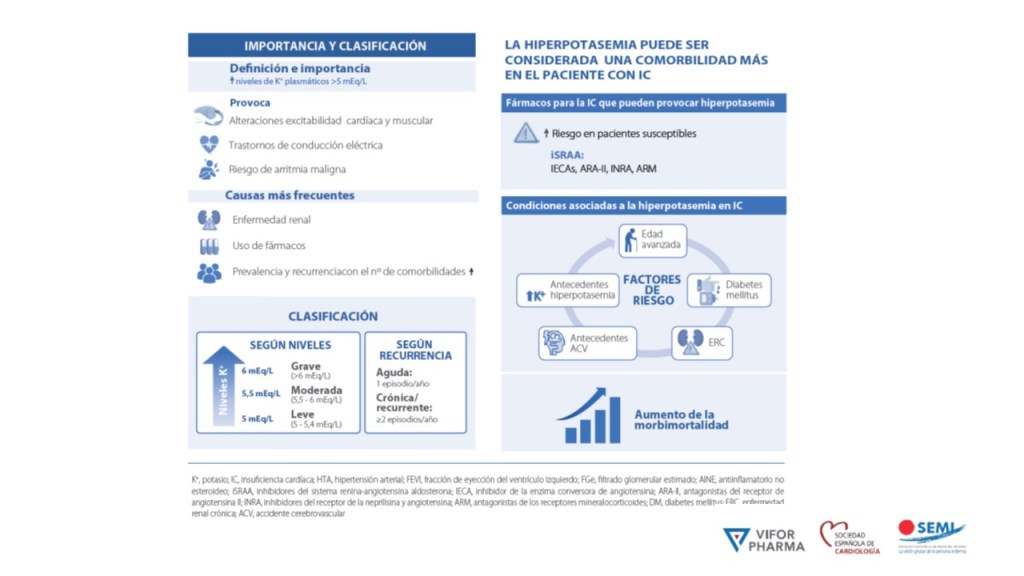 La hiperpotasemia en la Insuficiencia Cardiaca (IC) es relativamente frecuente. Los pacientes con IC, en virtud de la propia enfermedad, sus comorbilidades (enfermedad renal crónica (ERC) y diabetes) y al tratamiento con fármacos ahorradores de potasio presentan un riesgo elevado de hiperpotasemia, que puede llegar a afectar al 5,6% de los pacientes.